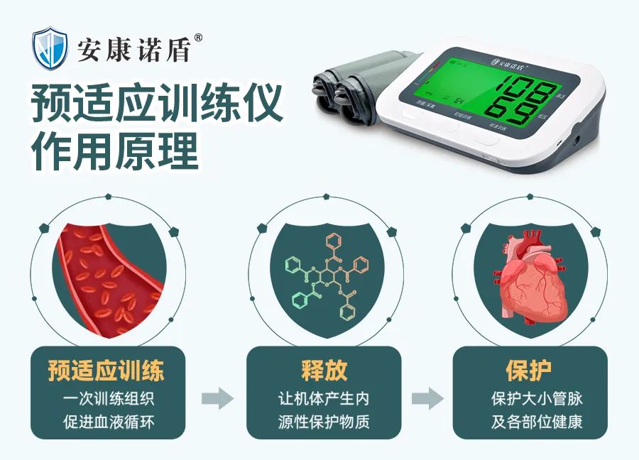 而安康諾盾缺血預(yù)適應(yīng)訓(xùn)練儀可通過經(jīng)常對人體進行反復(fù)的、短暫的、無創(chuàng)傷、無危害的缺血預(yù)適應(yīng)訓(xùn)練,激發(fā)人體免疫系統(tǒng)的應(yīng)急機制,從而達到預(yù)防心腦血管等疾病的發(fā)生。