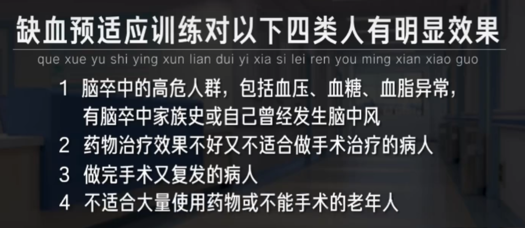 他表示,缺血預(yù)適應(yīng)的訓(xùn)練,主要是用于心腦卒中的預(yù)防和治療,經(jīng)臨床結(jié)果表明,對(duì)這四類人群有顯著的效果。
