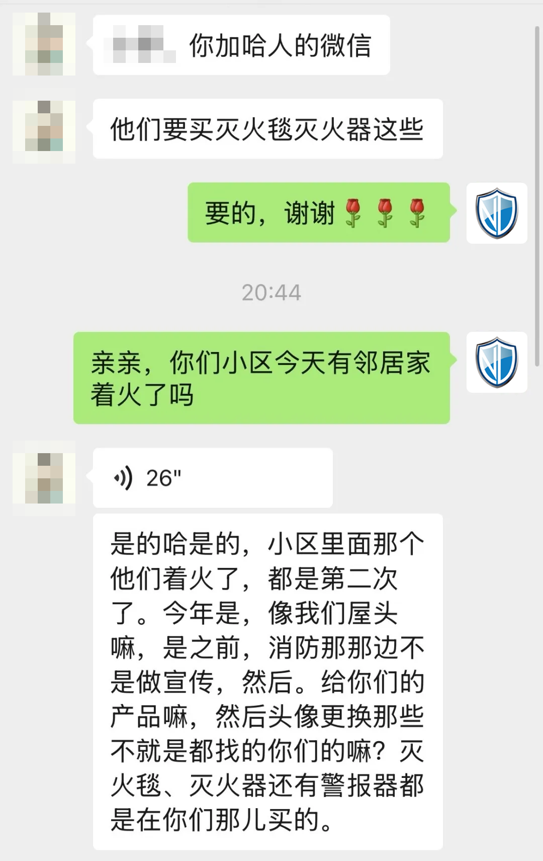 劉女士的分享很快引起了鄰居們的關(guān)注。王女士(化名)是第一個聯(lián)系安康諾盾客服的:“今年小區(qū)都發(fā)生兩起火災(zāi)了,家里還是準備點滅火的器材,萬一發(fā)生火災(zāi)還能用上,聽了劉女士的介紹,立馬下單了一套?!?/strong>
