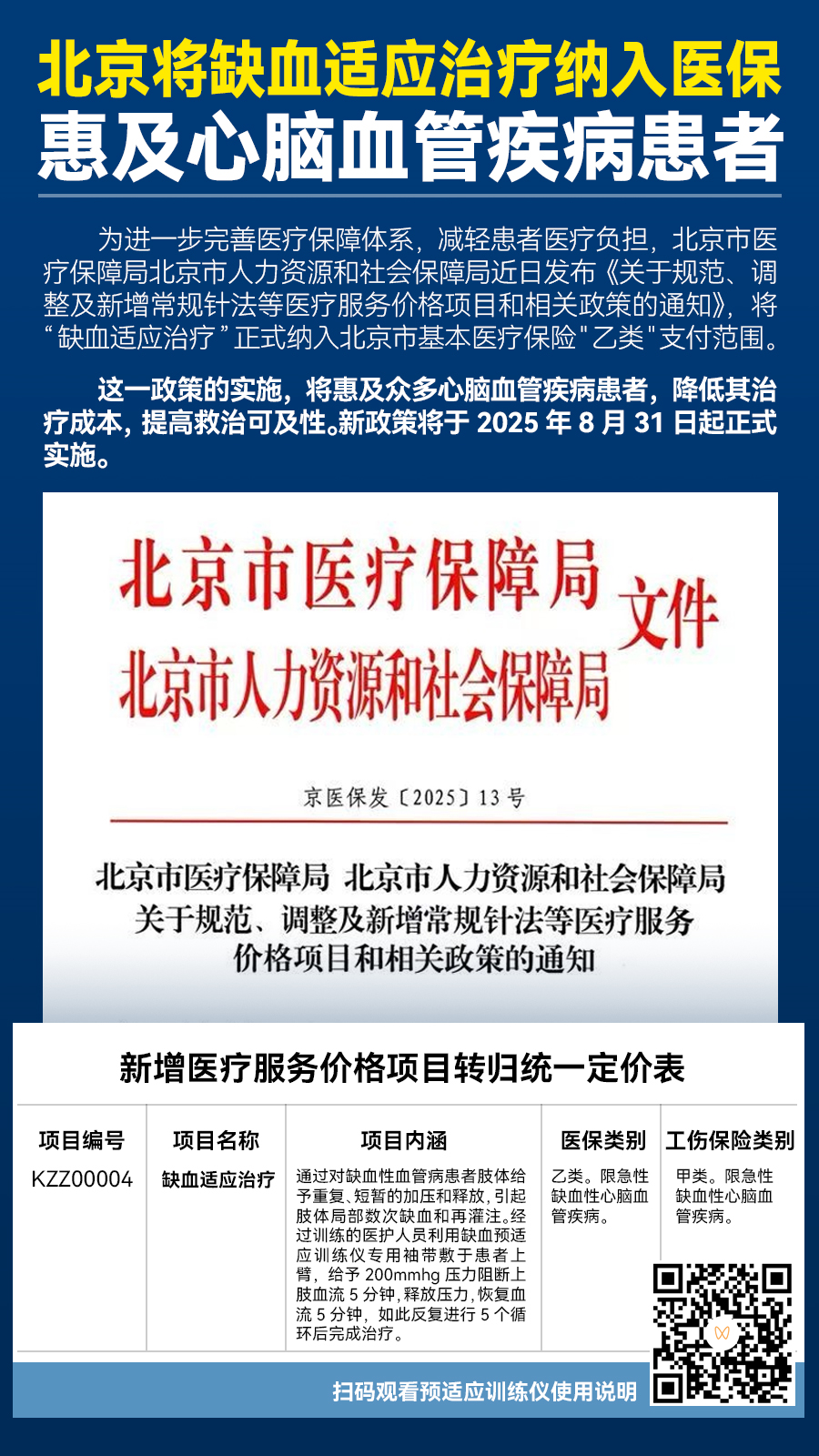 為進(jìn)一步完善醫(yī)療保障體系,減輕患者醫(yī)療負(fù)擔(dān),北京市醫(yī)療保障局北京市人力資源和社會保障局近日發(fā)布《關(guān)于規(guī)范、調(diào)整及新增常規(guī)針法等醫(yī)療服務(wù)價格項目和相關(guān)政策的通知》,將“缺血適應(yīng)治療”正式納入北京市基本醫(yī)療保險"乙類"支付范圍。